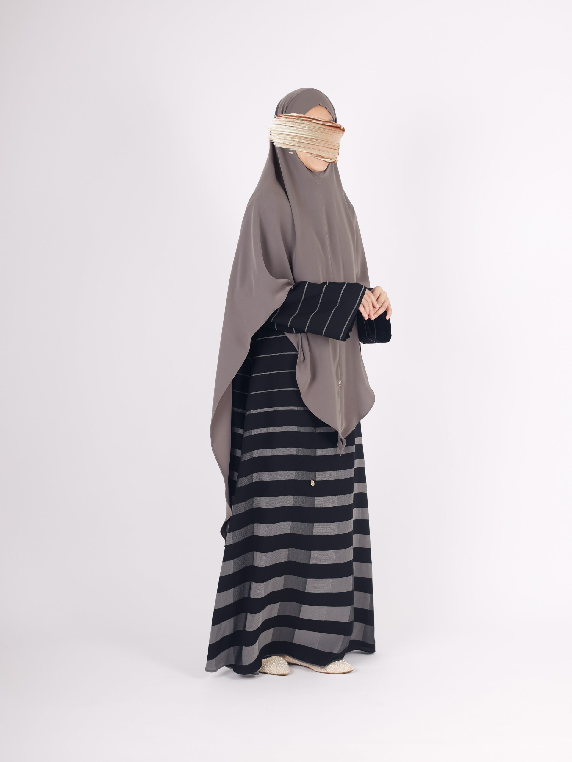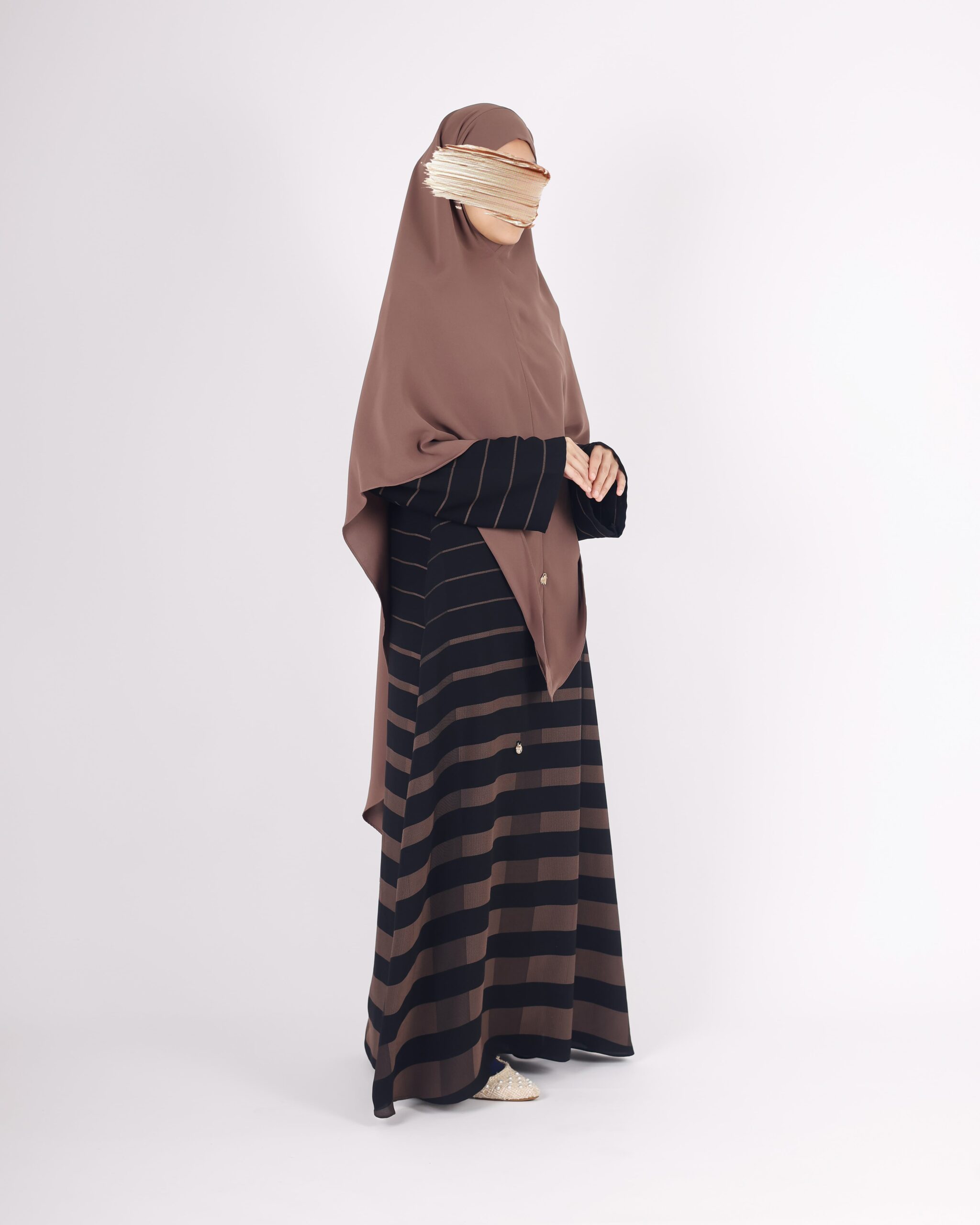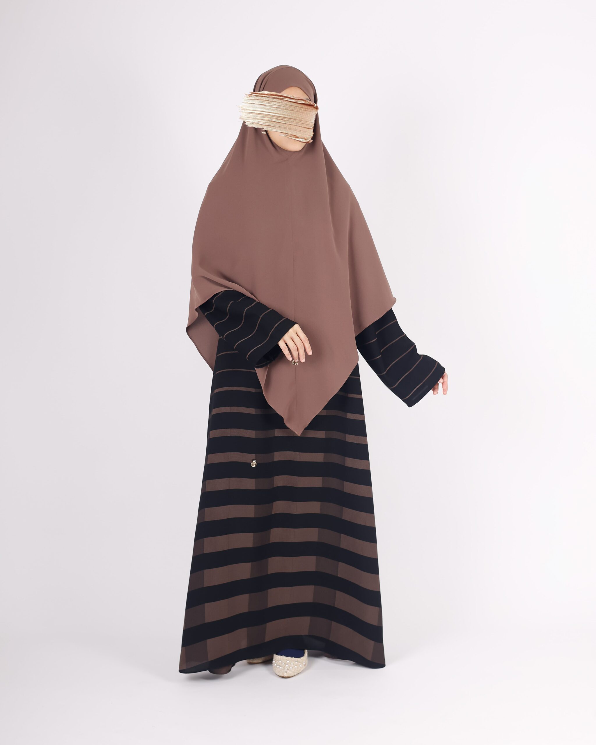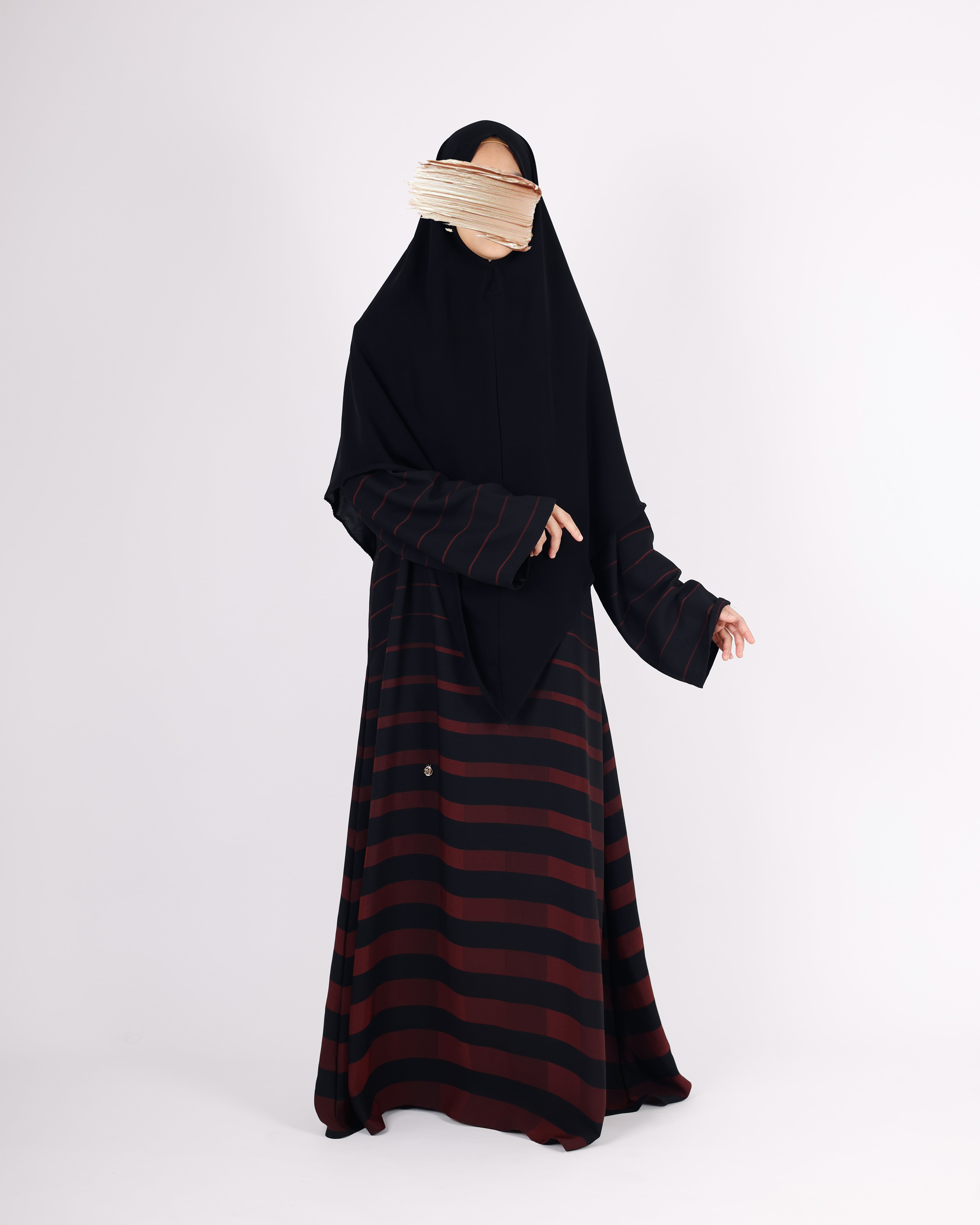 Ila Abaya memancarkan keanggunan melalui detail garis horizontal yang tertata rapi—dimulai dari bagian atas secara halus, lalu melebar perlahan ke arah bawah. Rancangan yang khas ini menghadirkan ilusi gerakan yang lembut, diperindah oleh sentuhan gradasi warna yang menyatu secara harmonis.