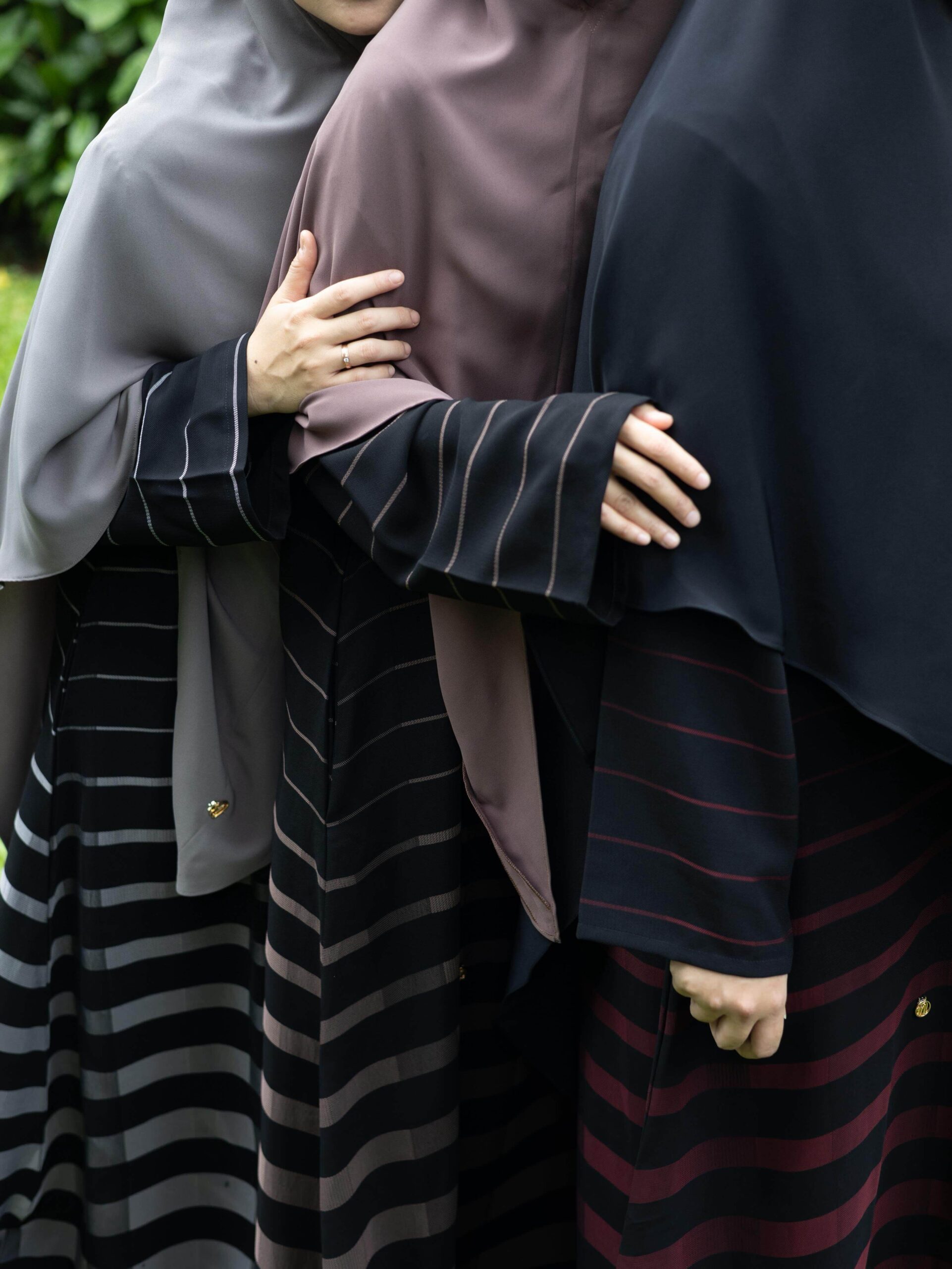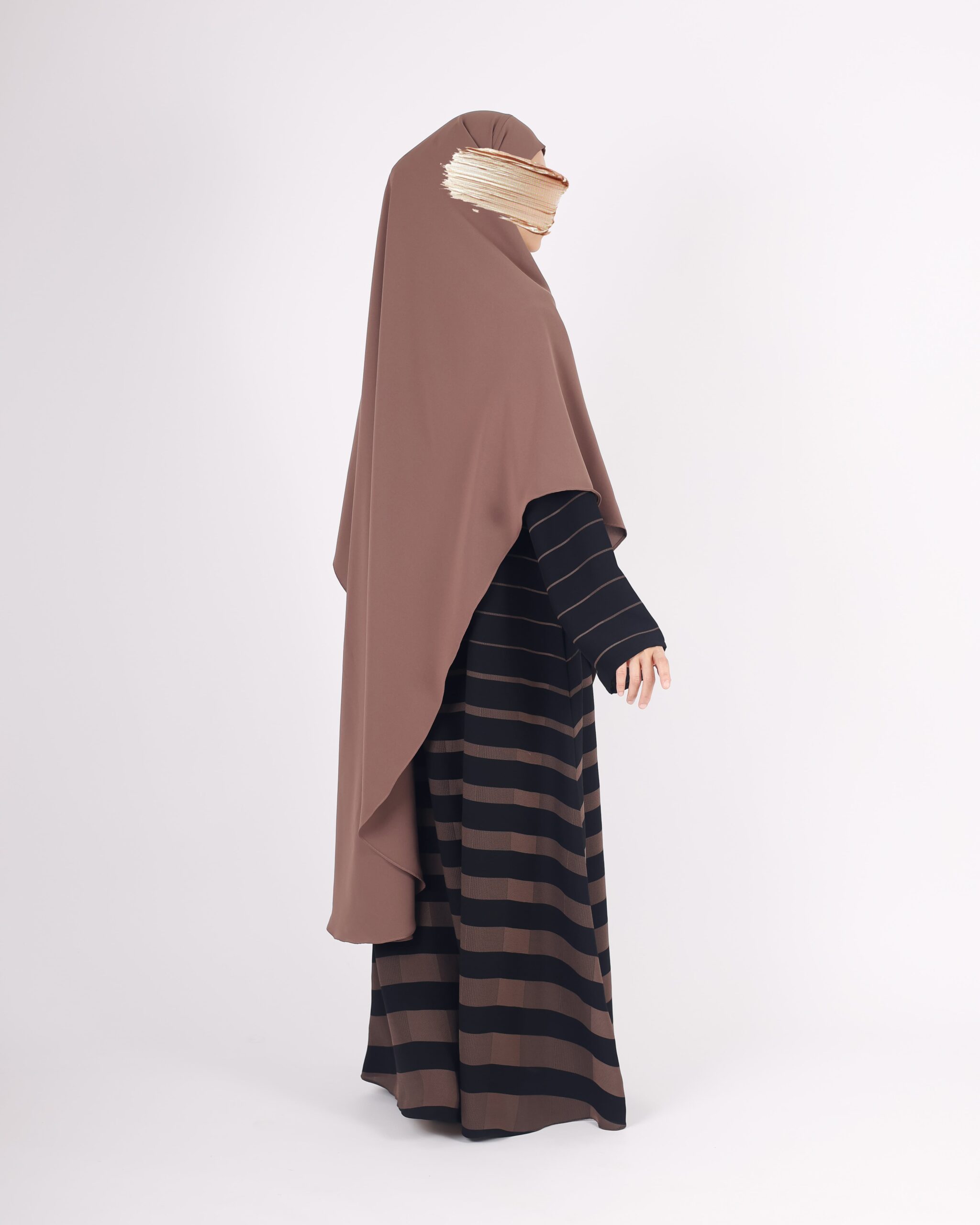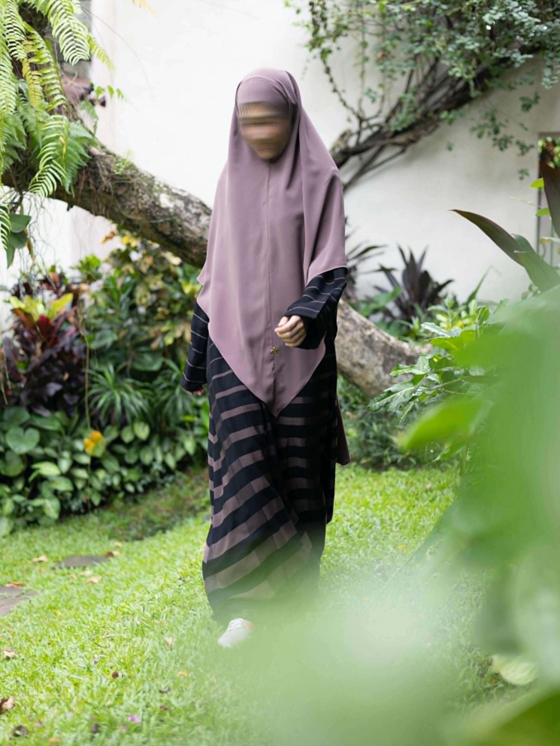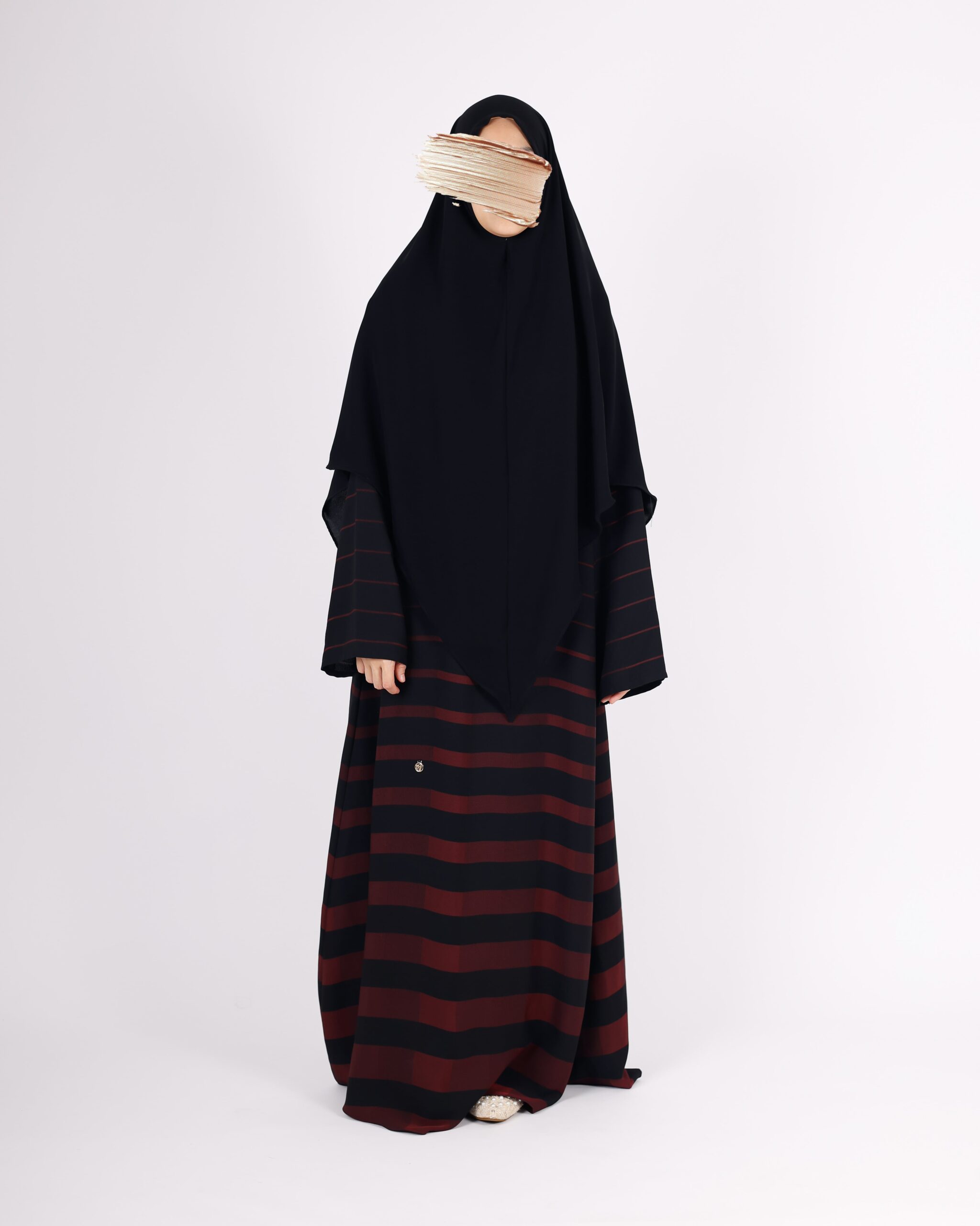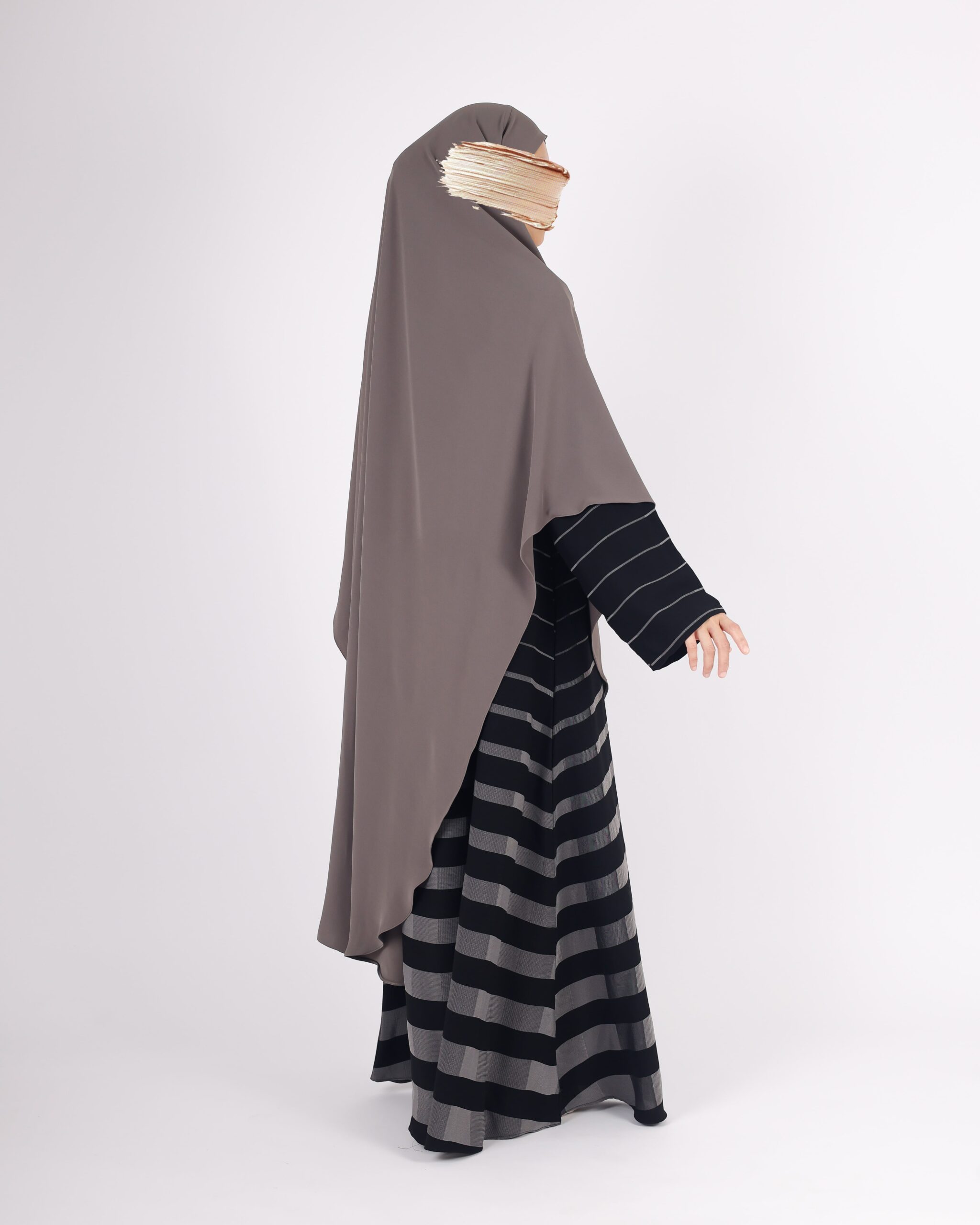 Ila Abaya memancarkan keanggunan melalui detail garis horizontal yang tertata rapi—dimulai dari bagian atas secara halus, lalu melebar perlahan ke arah bawah. Rancangan yang khas ini menghadirkan ilusi gerakan yang lembut, diperindah oleh sentuhan gradasi warna yang menyatu secara harmonis.