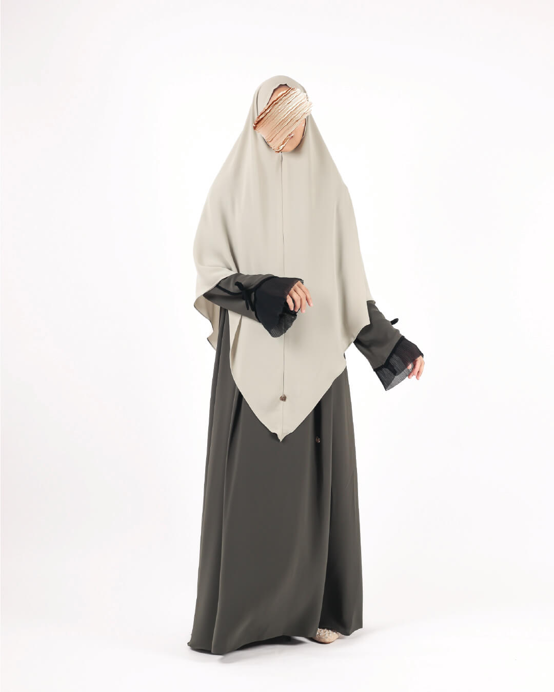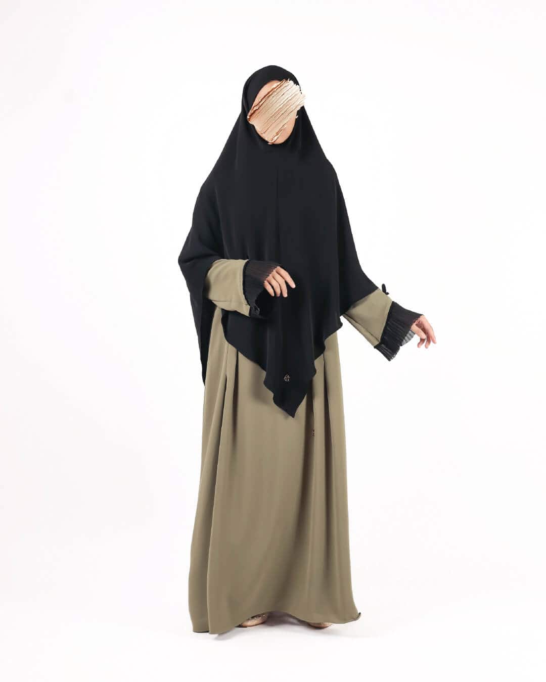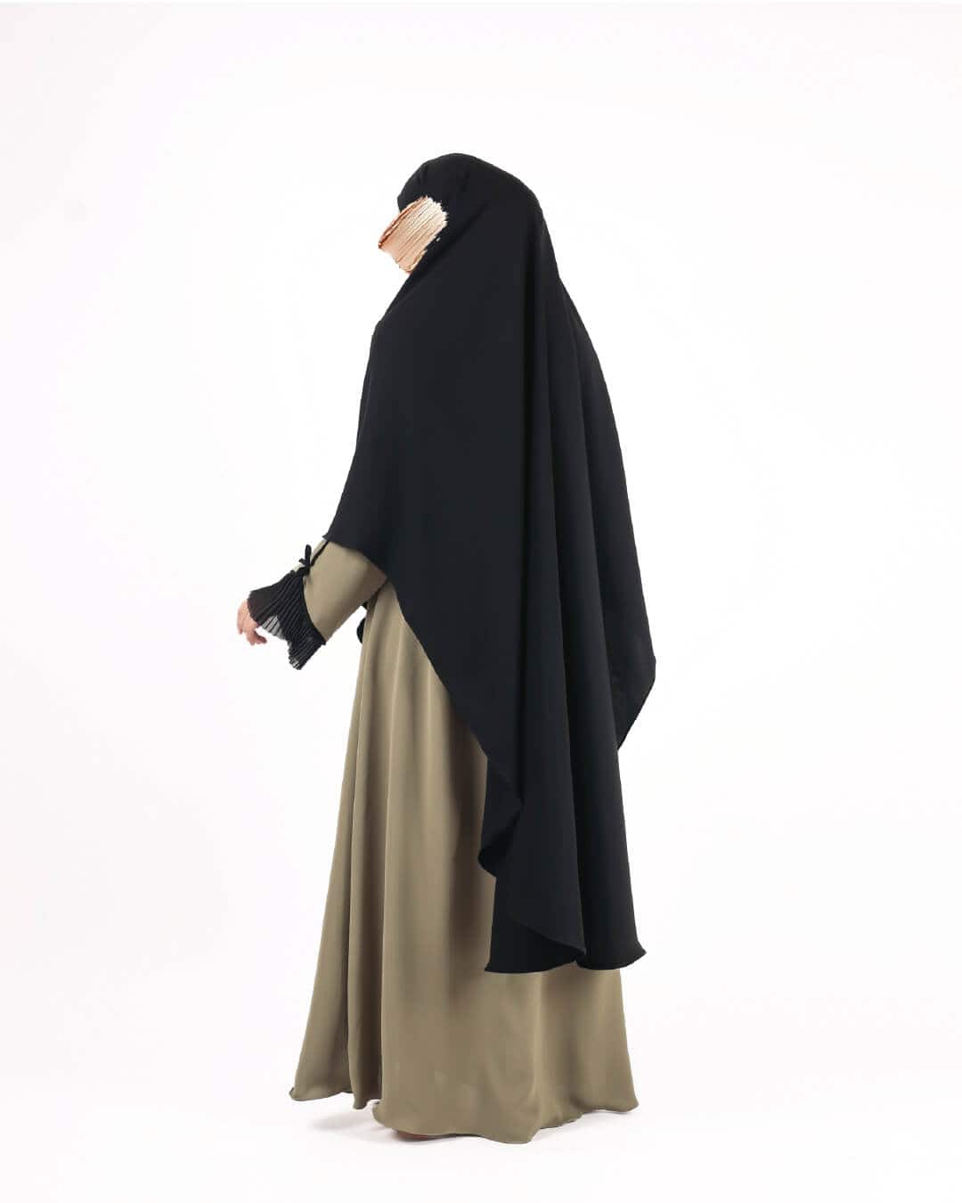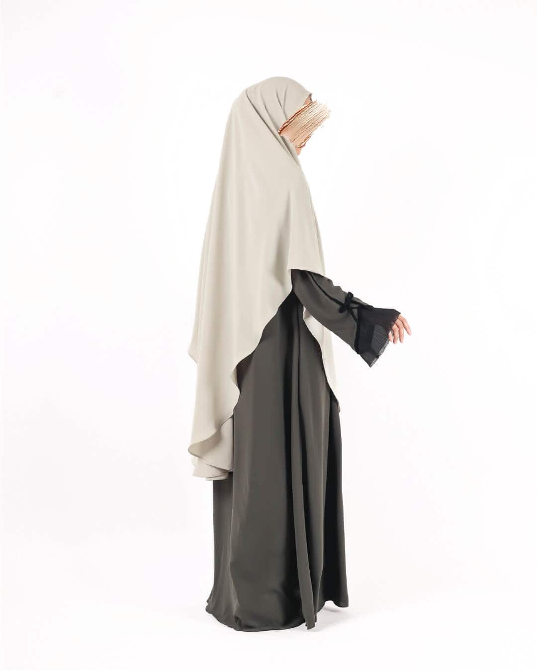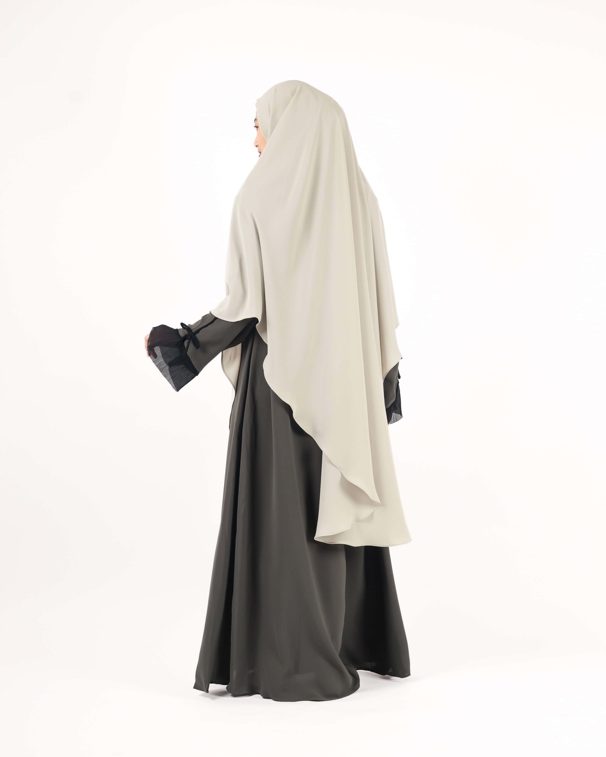 The Zahra Abaya is inspired by timeless beauty, symbolizing elegance and softness. The pleats on the wrist add a touch of sophistication and accentuate its feminine aura.